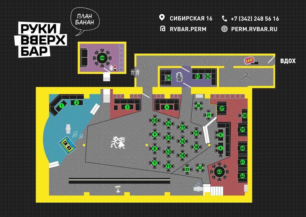 Руки ВВерх! Бар — культовое место на двух этажах, совмещающее в себе бар, ресторан, диско-клуб, караоке, концертную площадку и уютную VIP-комнату. Для удобства гостей предусмотрена бесплатная парковка.